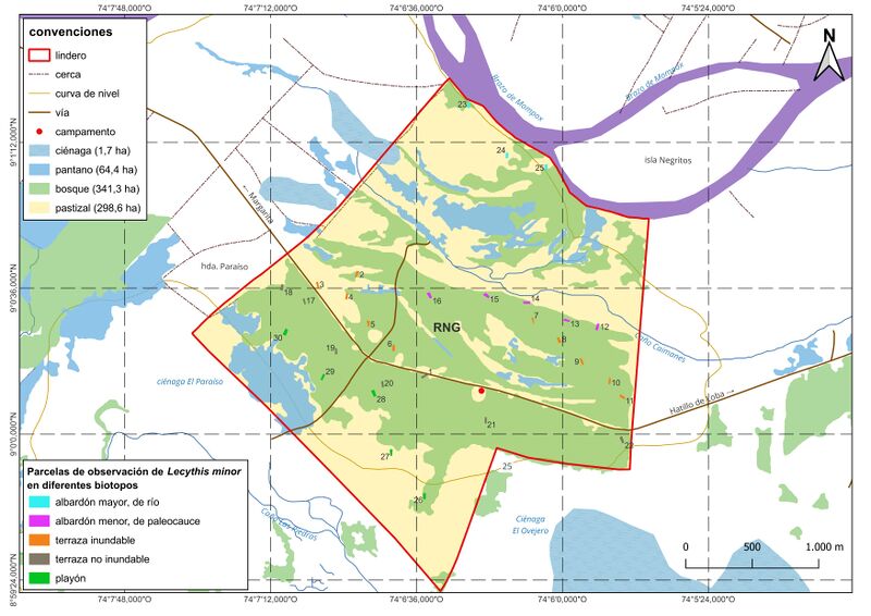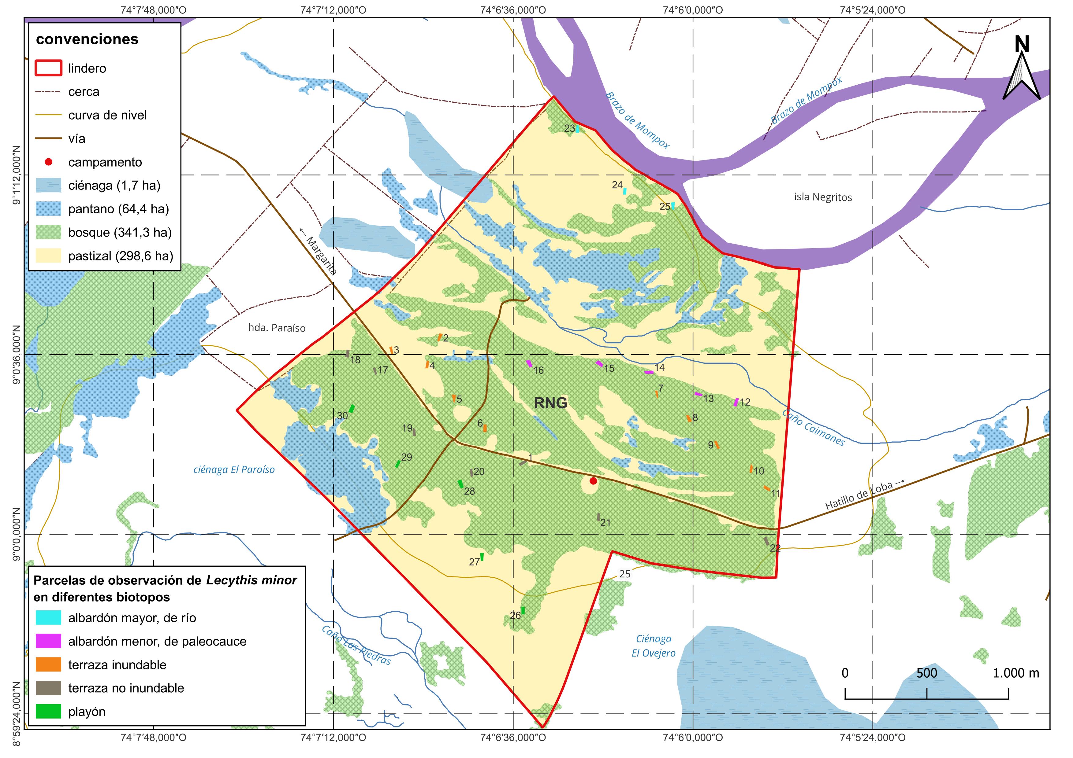Mapa de RNG con linderos definidos de acuerdo con escrituras y fichas catastrales de fincas La Floresrta I, La Floresta II y La Buenaventura. Las coberturas están delimitadas por IGAC. Ubicación de parcelas de observación de la población de Lecythis minor (coquillo u olla de mono) en la Reserva Natural El Garcero, noviembre-diciembre de 2020 Este texto debe ser revisado y complementado. Reempülazar mapa por el mismo centrado en la vertical (N–S) Lcgarcia (discusión) 06:04 14 nov 2025 (CET)